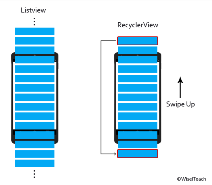 리사이클러 뷰는 사용자가 아래로 스크롤 한다고 가정했을 때, 맨 위에 존재해서 이제 곧 사라질 뷰 객체를 삭제 하지않고 아랫쪽에서 새로 나타나날 파란색 뷰 위치로 객체를 이동시킨다. 즉 뷰 객체 자체를 재사용 하는 것인데, 중요한 점은 뷰 객체를 재사용 할 뿐이지 뷰 객체가 담고 있는 데이터(채팅방 이름)는 새로 갱신된다는 것이다. 어쨋거나 뷰 객체를 새로 생성하지는 않으므로 효율적인 것이다.