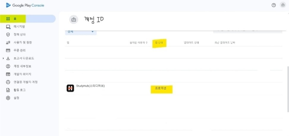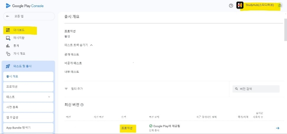 ⭐⭐⭐앱이 플레이스토어에 출시됐을 경우(플레이스토어에 내 앱이 보이는 경우) : 플레이콘솔 "홈" -> 앱상태 "프로덕션" 입니다.
