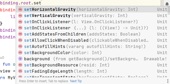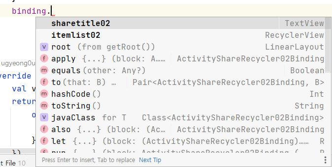 binding. 까지 쳤을 때와 binding.root. 까지 쳤을 때(오른쪽엔 set까지 더 쳤습니당 허헣) 템플릿으로 나오는게 다르다.