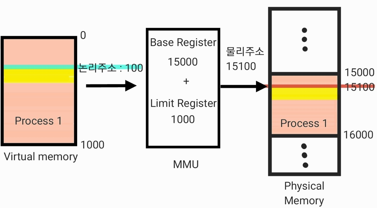 • 방법 : CPU에 의해 생성된 논리주소 +base 레지스터의 값 = 논리주소에 해당하는 물리 메모리주소