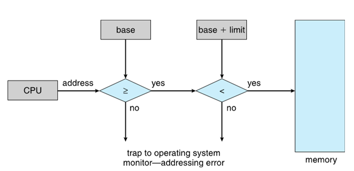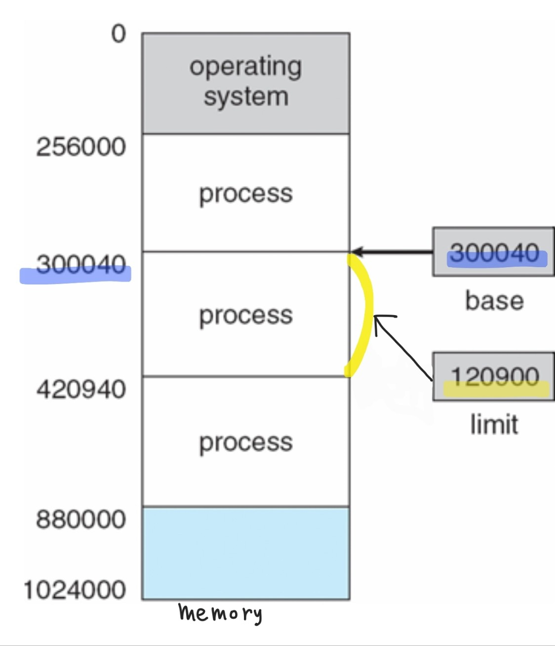 Memory protection을 위해 base register와 Limit register가 쓰인다.